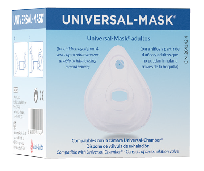 Silicone mask for use in adults with the Universal-chamber inhalation chamber, for children aged from 4 years up to adults who are unable to inhale using a mouthpiece.